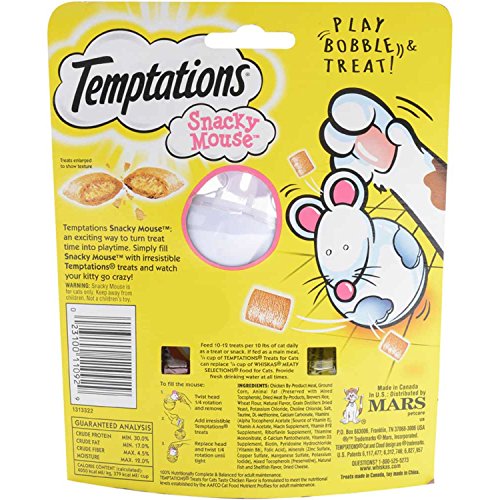 -. Binding : Misc. -. Brand : Temptations -. EAN : 0023100110929 -. Feature : Contains (1) TEMPTATIONS SNACKY MOUSE Cat Toy and (1) sample-size pouch of TEMPTATIONS Treats For Cats / Turn snack time into playtime with TEMPTATIONS Snack Toys / Simply fill this cat snack toy with TEMPTATIONS Cat Treats, and watch your kitty play with delight / These irresistible, low-calorie cat treats are 100% nutritionally complete for adult maintenance and help control tartar / America's #1 cat treat* (* Based on sales data) -. Label : Temptations -. Manufacturer : Temptations -. Model : 10120595 -. MPN : 10120595 -. PackageQuantity : 1 -. PartNumber : 10120595 -. ProductGroup : Pet Products -. ProductTypeName : PET_SUPPLIES -. Publisher : Temptations -. Size : .42 oz. -. Studio : Temptations -. Title : TEMPTATIONS SNACKY MOUSE Cat Toy for Cat Treats -. UPC : 023100110929