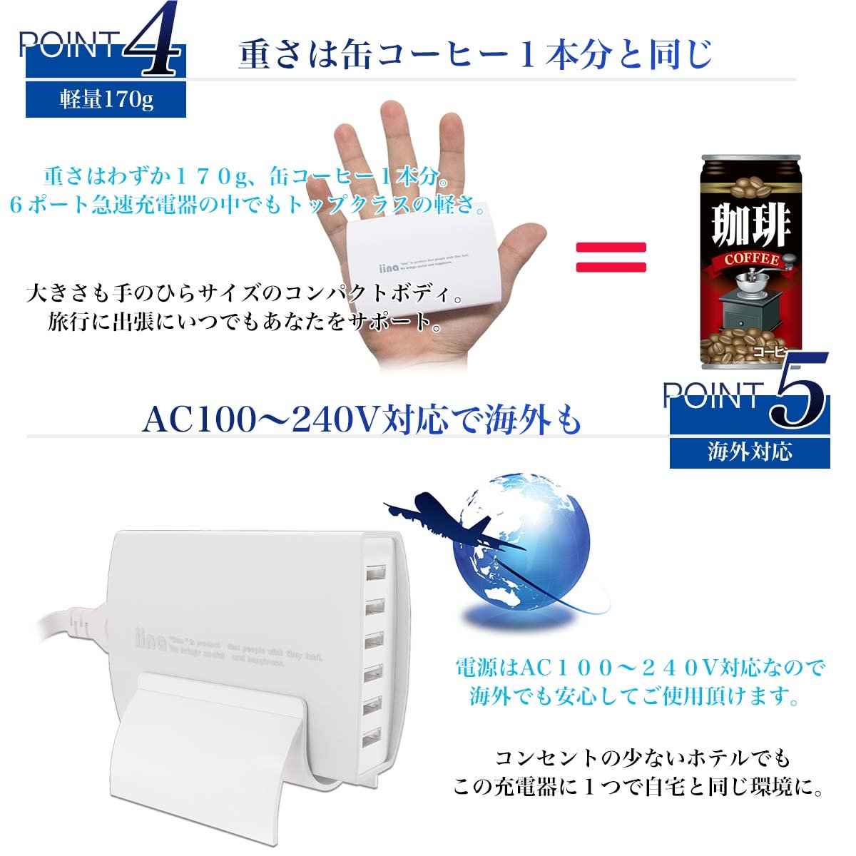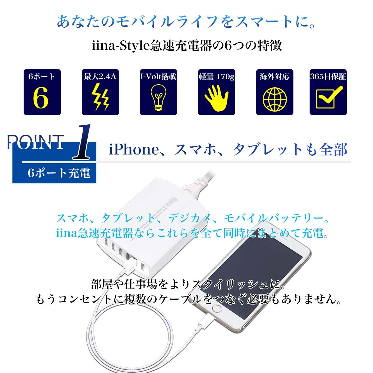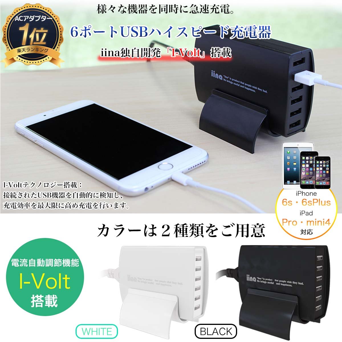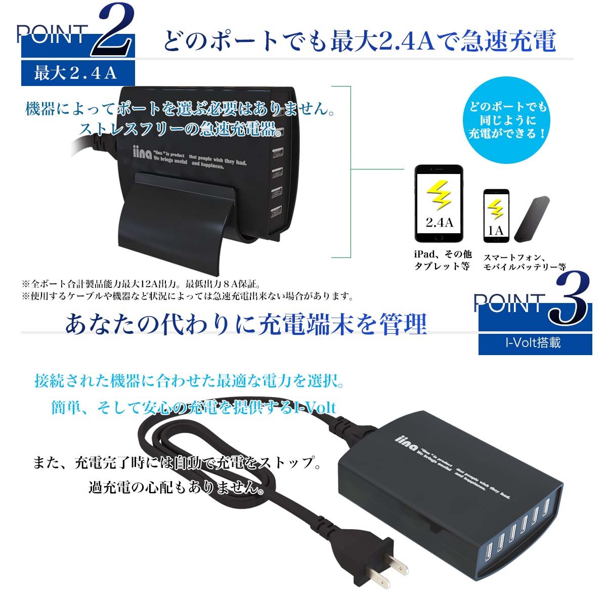 However, the "I-Volt" function on the iina charger sends current according to the connected equipment, and can be quickly charged even with various equipment.