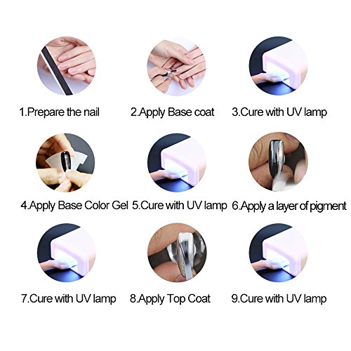 How To Use: Step 1. Apply base coat first. Cure under a UV light for 1 minute or an LED light for 30 seconds. Step 2. Apply basic color gel polish (any color is OK, black color is better ), cure with UV lamp for 2-3 minutes or cure with LED lamp for 60 seconds. Step 3. Apply the no clean top coat. Cure under a UV light for only 10 seconds (Important). Step 4. Use Sponge stick to pick the powder and apply it onto your nails. Rub the powder on the nails and cure under a UV light for 1 minute or an LED light for 30 seconds. Repeat the step untill you're satisfied with the effect . Step 5. Seal it with no clean top coat. Cure under a UV light for 1 minute or an LED light for 30 seconds.
