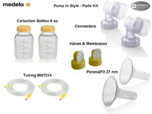 1-Medela Replacement Parts Kit Pump In Style Advanced with Large 27 mm Breast Shield and Tubing #8007214 Kit Includes authentic parts from Medela: Large size (27 mm) breast shield - 2 each of #87077. Connector - 2 each of #87076. Valve and Membrane - set of 2 each of #87089. Tubing (cloudy sticky tubing - Silicone, 42 inches length with one adapter on each end)) - 2 each of #8007214. BPA-free 5 oz/ 150 ml collection bottle with solid lid - 2 each of #6100050. NOTE: This kit is available in sealed packaging.