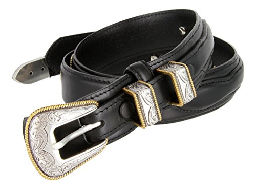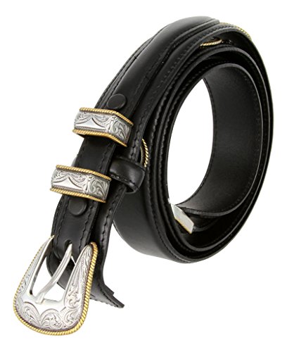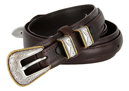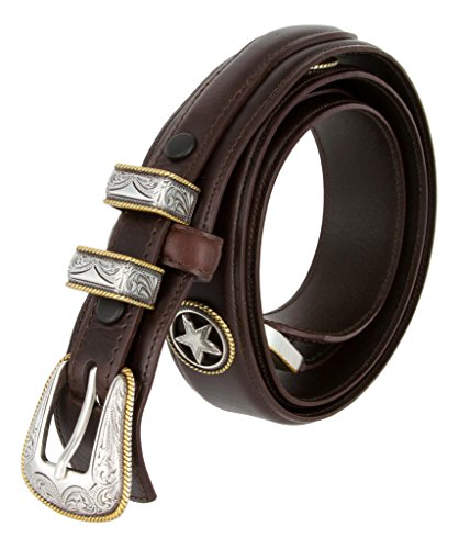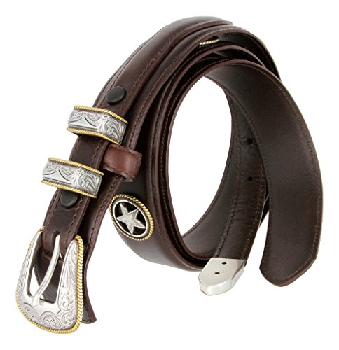 -. Binding : Apparel -. Brand : Belts.com -. Department : mens -. Feature : Genuine Leather / Matching Silver and Gold Finish 4-piece Buckle Set / 1-3/8"(35mm) Wide with 3/4" billets on buckle and tip end / Heavy-stiched for durability / Measure around where you wear the belt, with your pants on, and order that size. -. ProductGroup : Apparel -. ProductTypeName : ACCESSORY -. Title : Oil-Tanned Leather Western Ranger Star Belt for Men
