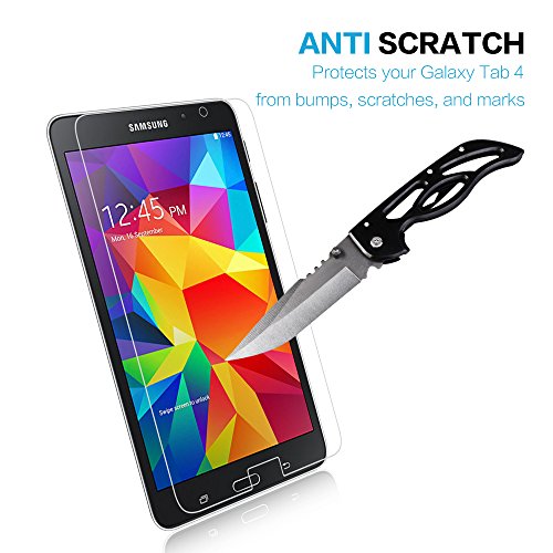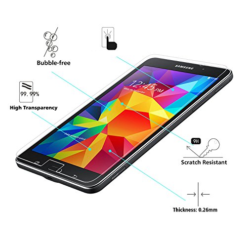 -. Feature : 0.26mm tempered glass screen protector designed for Samsung Galaxy Tab 4 7.0, 7 Inch ONLY, perfect cut and fit for your tablet's screen, 2.5D round edge provides more comfortable handle feeling than the right angle edge, and will never hurt your fingers / One-push super easily installation: Precise laser cut tempered glass made with polished, rounded edges, automatically attach to the screen smoothly, hassle-free and bubble-free. No residue when removed, can repeatable installation / Featuring maximum protection: 99.99% HD Clarity and Touchscreen Accuracy, Oleophobic screen coating magically resists oils and reduces annoying fingerP.R.Ints, against dirt and dust. Explosion-proof 9H Hardness Scratch-resistant screen protector can effectively protect your Samsung Galaxy Tab 4 7.0 from unwanted scuffs and scratches by knife, keys and some other hard substances / Lifetime no-hassle warranty provides easy lifetime protection for your tempered glass screen protector / Online video tutorials and detailed Instructions on how to correctly install your screen protector