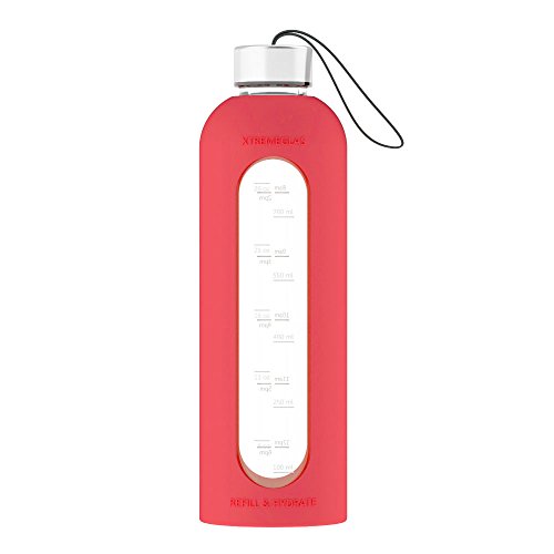 -. Feature : STAY HYDRATED & STAY HEALTHY: Large 32 oz capacity with updated time and ounce/milliliter markings to keep your hydration on track! Just drink 2 bottles a day to get your recommended daily water intake! / REUSABLE & BPA FREE - It's healthier to drink from glass knowing you won't be getting any BPA's from those plastic bottles. Save the environment one drink at a time by using a reusable glass bottle! / SPILL PROOF / LEAK PROOF STRONGER & WIDER BLACK STRAP LID: This bottle WILL NOT LEAK! Our 18-8 food grade stainless steel lids feature a removable food grade silicone o-ring that seals perfectly to the glass, ensuring NO LEAKS! Now with built in BLACK carry strap for those on the go with no worries about dropping it! Also comes with original Xtremeglas lid with no strap! / DISHWASHER SAFE: The bottle can be washed in the dishwasher over and over and will the markings will not fade! The neoprene carry sleeve can be machine washed. We recommend hand washing the lid for continued life. / ESSENTIAL OIL FRIENDLY: The all glass bottle coupled with stainless insert in the lid means you can safely use your essential oils in your bottle!