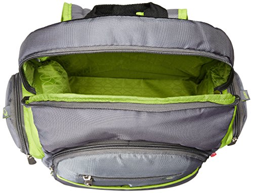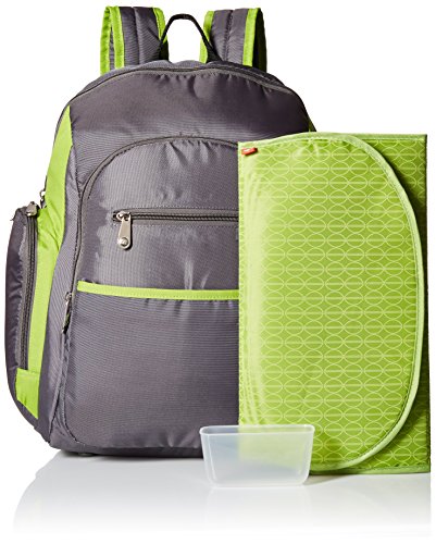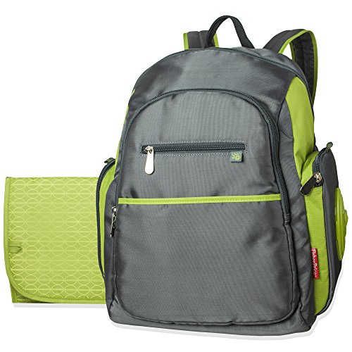 Upgrade your outings with this great looking bag from Fisher-Price. The FastFinderTM Pocket System includes: tablet/phone pouch, pacifier pocket and diaper pouch (with mesh pocket). Inside, a changing pad, and a brightly colored lining make contents quick-to-find.) A bottle pocket and refillable wipes holder are included. You'll appreciate padded, adjustable straps and a mesh covered back. The fabric handle makes it good-to-grab, and the plastic footed bottom keep contents sanitary. Fashion colors of steel gray with spring green trims hit the right note; and fabrications are wipe-clean. Your backpack will quickly become a must-have for outdoor events and occasions.Feature
