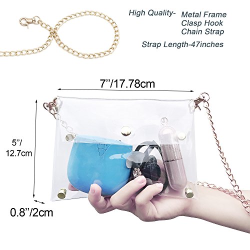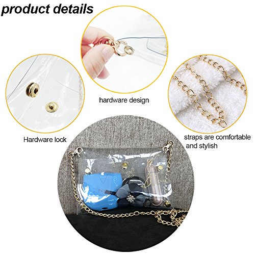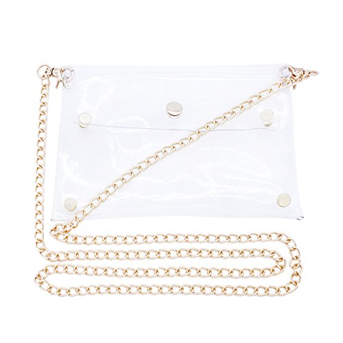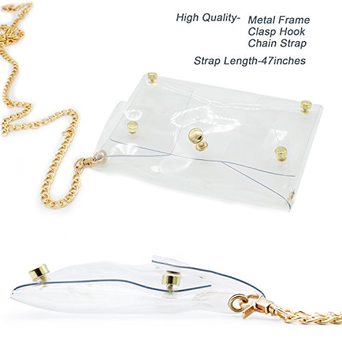 -. Feature : FINE MATERIAL & CUTE SHAPE:PVC Material. Wear resistant and shock resistant with strong and durable texture for comfortable carrying.,with gel lining and Gold Chain / NFL stadium approved;Clasp Closure / Detachable Chain Strap /Gold Color Hardware,FIt for Iphone 7/8 plus ;Dimension: 7x5x 0.8inches / MODERN DESIGN -Your new go-to.Show this stylish sleek clear bag at Stadium, Concerts,Party,Some Work, and all the places where only clear-bags are allowed. / NICE GIFT - If you want to give a gift for female friends,this clear stadium security bag a nice gift options and will meet all your demands.