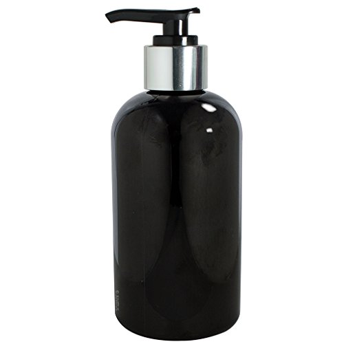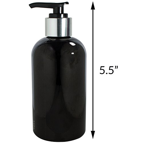 Black 8 oz Boston Round Refillable PET (BPA Free) Plastic Bottle with Shiny Silver / Black Lotion Pump Top (3 pack) + Labels