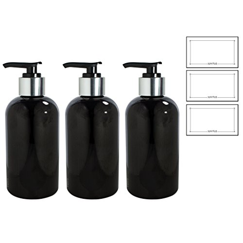 Includes 3 - Black 8 oz Boston Round Refillable PET (BPA Free) Plastic Bottle with Shiny Silver / Black Lotion Pump Top + 3 White JUVITUS Labels