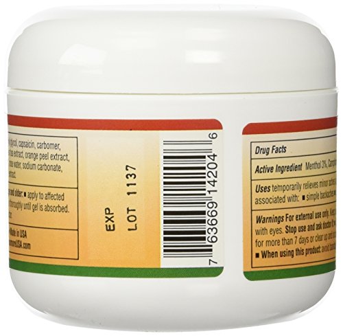 -. Feature : Relieves minor aches and pains of muscles and joints associated with arthritis, simple backaches, strains, bruises and sprains. / Absorbs quickly with a refreshing orange scent. / Unique warming and cooling ingredients. / Alcohol free, non-greasy, non-straining / Animal Free, Made in the USA