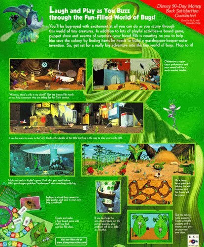 Active Play, A Bug's Life lets you explore the world of Flik and his friends. Help them ward off the evil grasshoppers bent on invading Ant Island. Build a special contraption, of Flik's invention, and rid the ants of the grasshoppers' terror. Travel to the game's six locations, build a board game or puppet theater, and gather facts about real-life bugs.