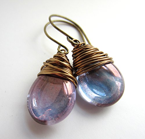 -. Title : Purple Wire Wrapped Earrings Czech Glass Drops Antiqued Brass Wire
