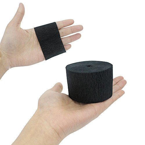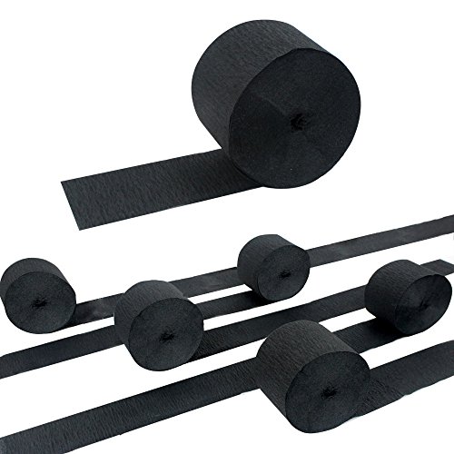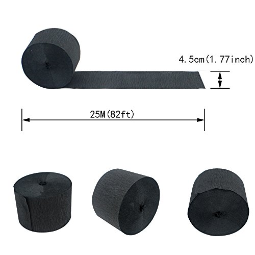 -. Feature : Package contains 6 rolls of 82ft Black Crepe Paper Streamers / Color: black / Size: width - 4.5cm, length - 25M / Each roll of paper is neatly bundled, easy to unlock and easy to hang. With commonly used black color; Suitable for any DIY handicrafts, such as decorating your bedroom and so on / This set of elegant paper streamers is ideal for a variety of themed parties, birthday parties, summer parties and baby showers, Christmas parties and festive queues, etc