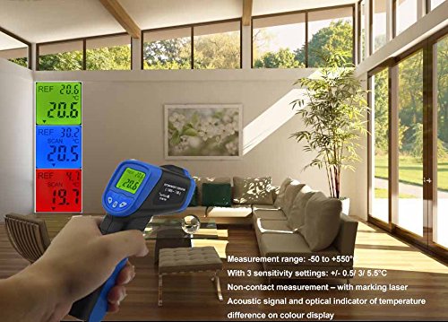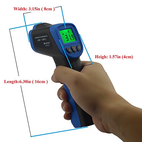 ✔【MEASURE MAX UP TO 1022℉ WITH HIGH ACCURACY】Temperature range: -50 ~ 550℃ (-58~1022℉); Accuracy: ±1.5% or ±1.5℃; Distance to Spot Size: 12:1 ; Emissivity: 0.1-1.0(Adjustable); Response Time: <500ms.