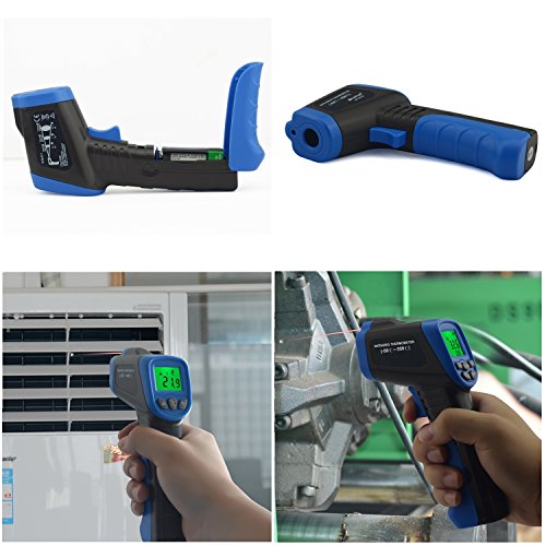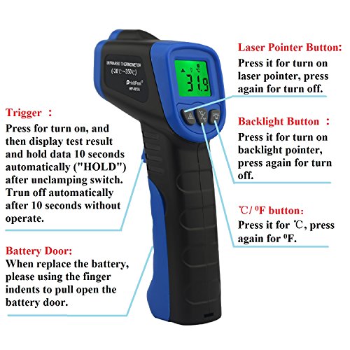 ✔【MULTIFUNCTIONAL INFRARED THERMOMETER YOU WILL NEED】Optional Laser Target Pointer and Backlight ON/OFF, convenient to accurate targeting and operate in case of poor illumination; ℃/℉ button - switching the displayed temperature from Celsius degree to Fahrenheit degree as you need.