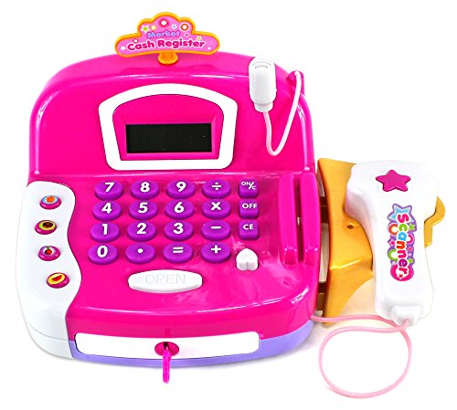 -. Feature : Deluxe Smart Flower Cash Register Pretend Play Battery Operated Toy Cash Register / Working Scanning Action, Press Button on Scanner, Will Light Up and Make Sound! Press Intercom Button to Speak Through Microphone! / Comes w/ Mock Money, Credit Card, Toy Food, Shopping Basket / Develop Math Skills with Real Working Calculator w/ Addition, Subtraction, Multiplication, Division Functions / Requires 3 AA Batteries to run (not included)