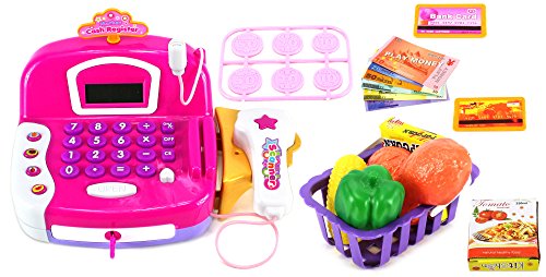 -. Title : Deluxe Smart Flower Cash Register Pretend Play Battery Operated Toy Cash Register w/ Working Scanning Action, Real Calculator, Working Microphone, Toy Food, Shopping Basket