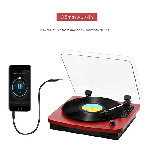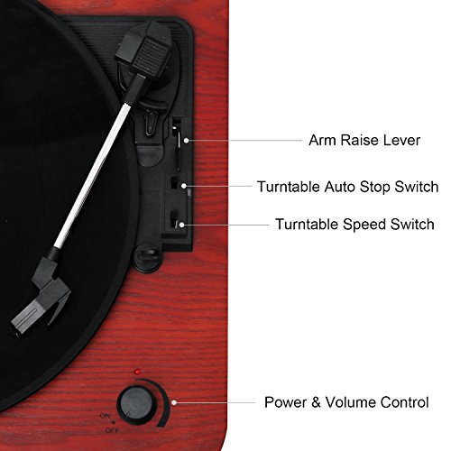 Auto Stop: The turntable will stop working automatically when it comes to the end of a record by adjusting the auto-stop switch; 2 Built-in Speakers can also play the music from your mobile phone or mp3 player by using a 3.5mm audio cable.
