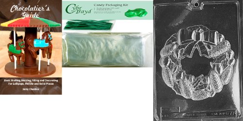 Cybrtrayd Wreath with Hole Chocolate Mold with Chocolatier's Bundle of 25 Cello Bags, 25 Green Twist Ties and Chocolatier's Guide