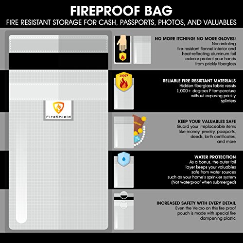 11”x7” Fireproof Bag – No Itchy Fiberglass - Black Fire Resistant Interior Material - Safe Storage For Cash, Passports, Photos, and Valuables