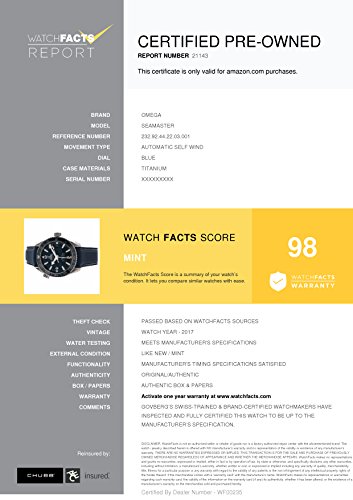 -. Feature : Omega Seamaster 232.92.44.22.03.001 with blue dial / Authenticated by WatchFacts. Grade Rating: 98 / Condition: Mint / Comes with original box and manufacturer's papers offered with this watch / Automatic-self-wind movement / Watch year: 2017