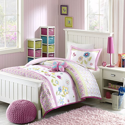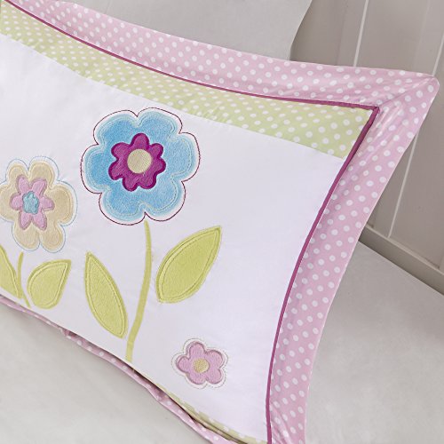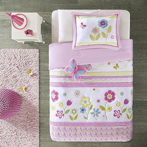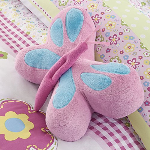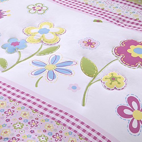 Spring bloom is adorned with pink, green and Blue flowers to complete a young girl's blossoming bedroom. A pink border frames the comforter and a pink and white gingham print covers the reverse.
