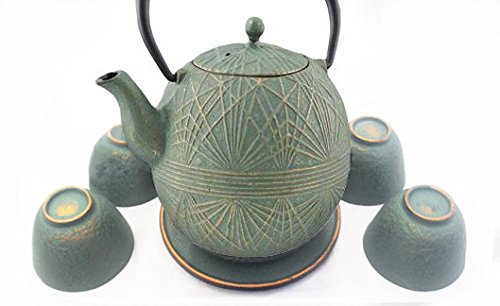 -. Feature : Cast Iron Tea Set. / Set Includes: One Teapot 27 oz, Four Teacups, One Trivet and Stainless Steel Strainer. / Enamel coating to prevent rusting. / Brand New in Gift Box.