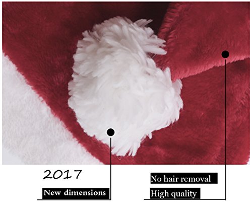 -. Feature : width:12.6 inch/32CM,length:16.7inch/42CM / 2017 new revision, width increased, better quality,no hair off, not fade / High quality red fuzz & Comfort Liner, Moisture wicking, soft comfortable fabric to protect your head and hair without irritation or sweat! our santa hat without any rough and scratchy red fuzz will never make you feel embarrassed when you take the hat off. 100% Money Back Guarantee. / Highest quality materials and workmanship ensures this will last for many seasons to come! This fuzzy soft material will keep you snly warm in those cold winter nights! / BUY WITH CONFIDENCE:our highest quality santa hat will never make you down.May the joy and warmth of Christmas fill your home with happiness.