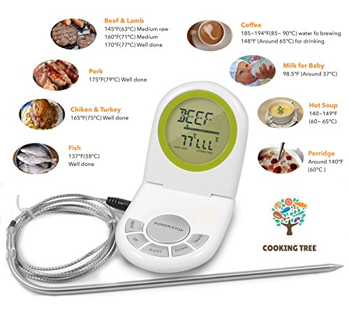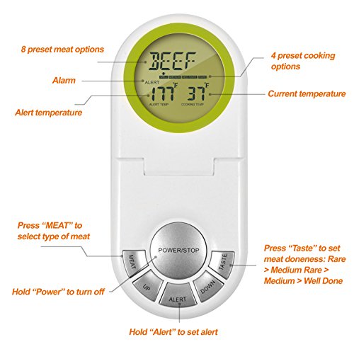 Take all the guesswork out of roasting and grilling Every serious cook knows that the only reliable method to determine how well meat is cooked is with a meat or grill thermometer. Determining the correct cooking time requires experience and skill. Now you can cook your lamb and beef to your preference - well done, medium rare or rare. Just choose the setting and let the thermometer do the rest. This probe thermometer comes with suggested cooking temperatures for several different meats, poultry and fish. You won't need to look up the cooking temperature with the pre-set temperatures. Versatile, portable and efficient Use indoors and out. The probe can be used in a grill, barbecue or oven. The wire lead is long enough for the probe to be left in your meat and the oven door to be closed on it without damaging the seal. A pot lid can close on the wire, and the lid to your griller or smoker can also be closed securely on the wire. No heat will escape. Now there's no need to open the oven and check. There will be no left-over! This temperature sensor thermometer will turn you into a great home cook. Imagine roasting a medium rare whole eye fillet without the stress and worry of how it might turn out. It makes big family BBQ get together a whole lot easier. This clever kitchen tool makes a perfect gift or a welcome addition to the arsenal of a busy cook. Requires 2 x AAA batteries (not included) Click "Add To Cart" at the top of the page to grab your thermometer timer today. Lifetime Warranty 0 |