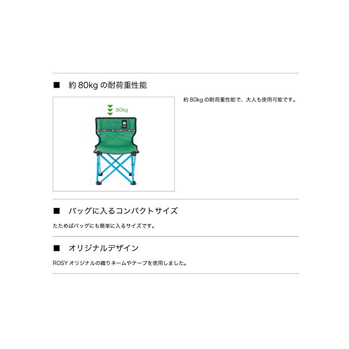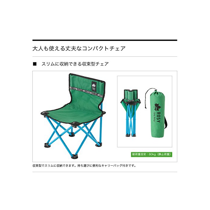 logos ROSY 타이니 체어(그린) 73170042 (체어)총중량:(약)1.2kg 사이즈:(약)34×34×48cm(앉은 키25cm)수납 사이즈:(약)13×48cm내 하중 기준(정지 하중):(약)80kg 주요하 소재:[프레임]스틸[원단]폴리에스텔