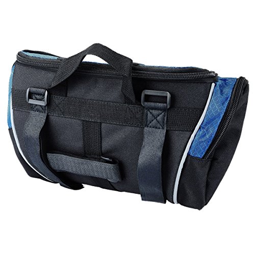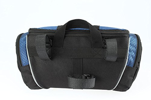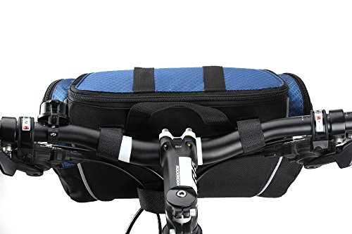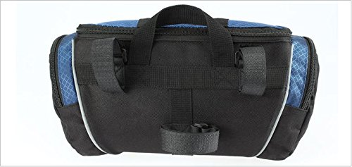 1. Type: Bike handlebar bag 2. Material: 600D and Water resistant Polyester? 3. Color: Silver Black, Blue Black 4. Size : 32 cm x 17 cm x 11 cm, 4L capacity 5. Weight: 320g