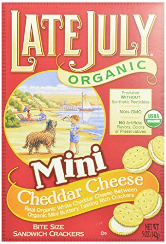 -. Binding : Grocery -. Brand : Late July -. EAN : 0890444000809 -. Feature : Case of 12, 5-ounce boxes (total of 60 ounces) / Child-friendly snack of real white cheddar cheese between buttery-tasting rich crackers / USDA-certified-organic; no trans fats or hydrogenated oils; lacto-vegetarian / Late July brand name inspired by carefree mid-summer days when it's family time / Made by the Bernard family's snack-food business (founder of Cape Cod Potato Chips ) in Hyannis, MA -. Label : Late July -. Manufacturer : Late July -. MPN : 00080 -. NumberOfItems : 12 -. PackageQuantity : 12 -. PartNumber : 00080 -. ProductGroup : Grocery -. ProductTypeName : GROCERY -. Publisher : Late July -. ReleaseDate : 2005-12-22 -. Size : 5 OZ -. Studio : Late July -. Title : Late July Organic Mini Cheddar Cheese Bite Size Sandwich Crackers, 5-Ounce Boxes (Pack of 12) -. UPC : 890444000809