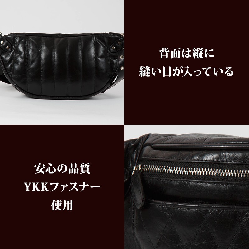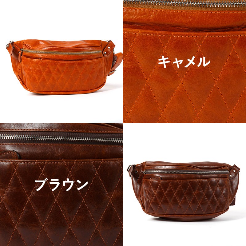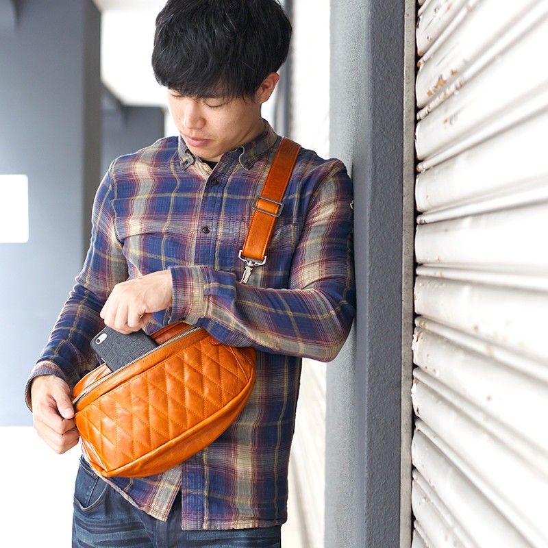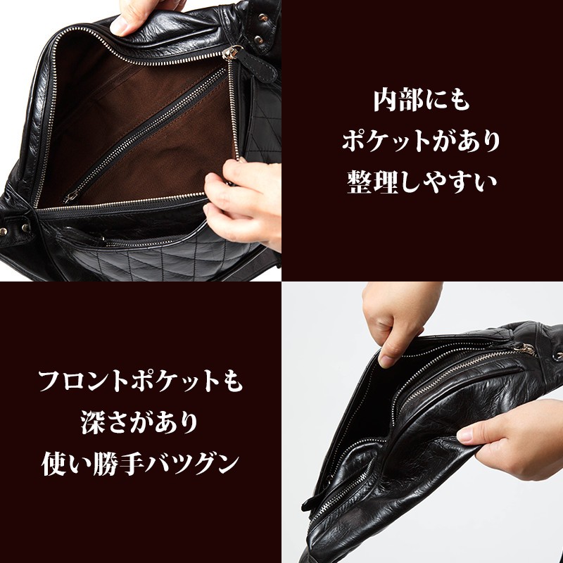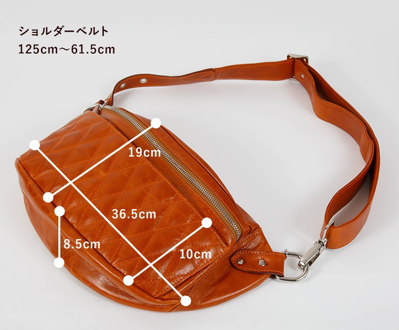【素材】 牛革 【サイズ】本体外寸 高さ:約19cm 幅:約36.5cm マチ:約8.5cmベルト長さ 112cm~61.5cmフロントポケット 深さ:10cm 幅:32cm内部ポケット 幅:20cm 深さ:10cm【カラー】キャメル・ブラウン・レッド・ブラック【仕様】ポケット×2 (フロント×1、内部×1) 上質の牛革を使用して革職人がハンドメイドで仕上げたレザーボディバッグ。財布等普段持ち歩く小物も収納可能。柔らかいレザーで身体にフィットするのが特徴です。大き目サイズで、大容量。オフの日以外でも、通学・通勤にもピッタリなバッグです。使い込むほどに渋味が出て末長く愛用出来ます。Deep Zone ワイルドでセクシーを上品にまとめる男のレザーブランド。自分買いからプレゼントにも人気でオススメです。