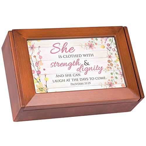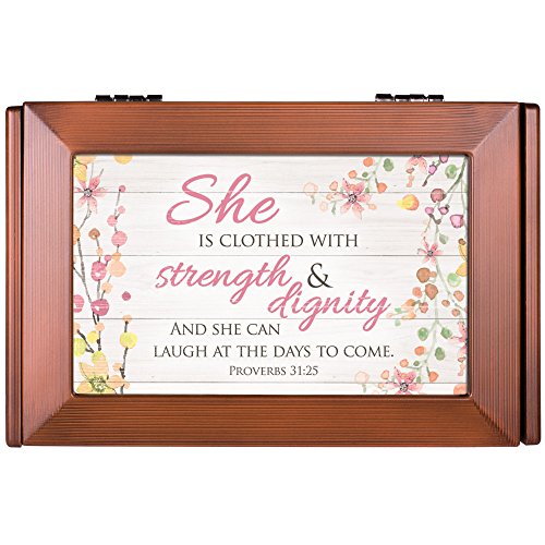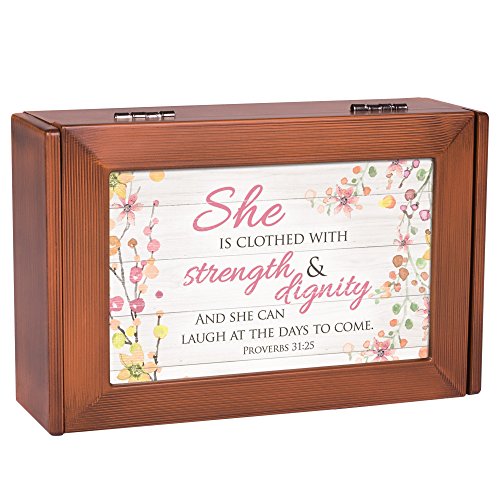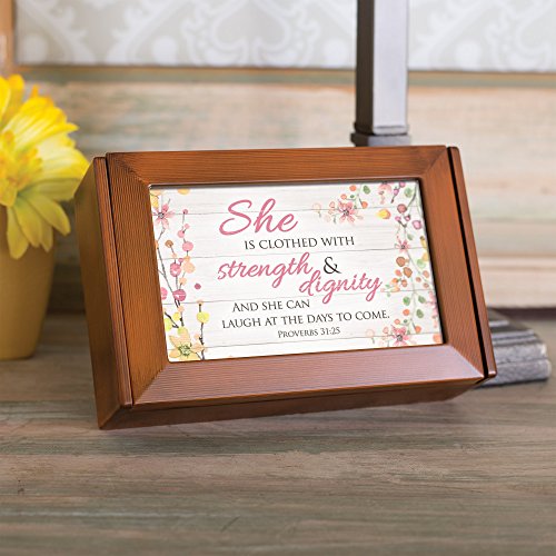 -. Binding : Kitchen -. Brand : Cottage Garden -. EAN : 0633303830601 -. Feature : Features scripture verse Proverbs 31:25 / Made of polycast with black finish; jewelry compartment lined with rich, black velvet / Personalize by replacing sentiment art with a 4 x 2 inch photo / Measures approximately 6 x 3.75 x 2.75 inches; packaged carefully in fitted bubble bag and box ready for gifting / Hinged top lid for secure and easy opening and closing -. IsAutographed : 0 -. Label : Cottage Garden -. Manufacturer : Cottage Garden -. MPN : DP61S -. PartNumber : DP61S -. ProductGroup : Home -. ProductTypeName : HOME -. Publisher : Cottage Garden -. Studio : Cottage Garden -. Title : She is Clothed With Strength Dignity Floral Woodgrain Finish Petite Keepsake Jewelry Box -. UPC : 633303830601