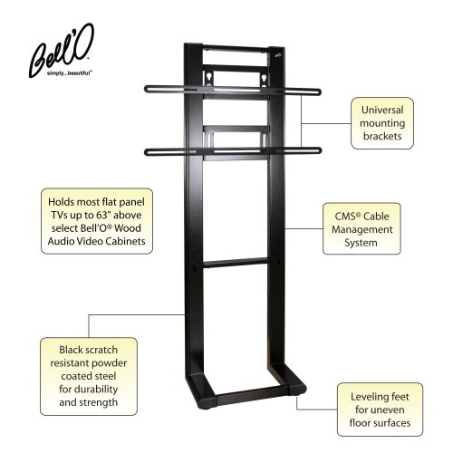-. Binding : Electronics -. Brand : Bell'O -. Color : Black -. EAN : 0748249000596 -. Feature : Constructed of heavy duty, scratch resistant, powder-coated steel / Includes universal mounting brackets and most common hardware needed for TV mounting / Perfect for suspending most flat-panel televisions up to 63" wide and less than 175 pounds / Designed for use with Bell'O models WAVS32, WAVS325 and WAVS33 as well as PRO Bell'O models PR-1, PR-15 and PR-25 / Designed for use with Bell'O models WAVS320, WAVS325 and WAVS330 as well as PRO Bell'O models PR-10, PR-15 and PR-25 / Integrated Bell'O Cable Management System hides wires and interconnect cables -. IsAutographed : 0 -. IsMemorabilia : 0 -. Label : Bello -. LegalDisclaimer : Shipping only to the lower 48 Contiguous United States. This is As-Is with no return. However, im willing to communicate to any questions/answers/concern that maybe there. -. Manufacturer : Bello -. Model : PP59B -. MPN : PP59B -. NumberOfItems : 1 -. PackageQuantity : 1 -. PartNumber : PP59B -. ProductGroup : Speakers -. ProductTypeName : AV_FURNITURE -. Publisher : Bello -. Size : 24.00 x 22.00 x 65.00 -. Studio : Bello -. Title : Bell'O PP59 TV Mount, Black -. UPC : 748249000596 -. Warranty : 1 year manufacturer