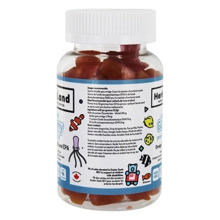 -. Feature : 100% NATURAL: Non-GMO, Gluten, Dairy, Nut and Soy-Free. No synthetic colors, artificial flavors, or artificial sweeteners. Organic Cane Sugar, Organic Tapioca Syrup, Organic Sunflower Oil. / HIGHEST QUALITY INGREDIENTS: Herbaland Classic Gummy for Kid's Omega 3 with DHA & EPA Strawberry & Orange Flavor are sourced from high-quality fish oils rich in DHA from wild sustainably harvested Canadian stocks. / HEALTH SUPPORT: Omega-3 fatty acids like DHA (docosahexaenoic acid) and EPA (eicosapentaenoic acid) are essential for proper brain development and for overall health and growth. DHA supports brain, retina, and nervous system development1, and studies sest that DHA may improve reading and behavior in children / CERTIFICATIONS: All products are manufactured in Canada under GMP compliant and quality standards set by the Natural Health Products Directorate of Health Canada. Sustainable and locally sourced raw materials and finished products are tested by independent 3rd parties. / RECOMMENDED USE: For children of 4 years old and over. Take 3 gummies 3 times per day, a few hours before or after taking other medications.