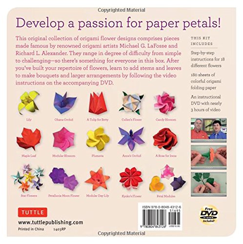 -. Author : Michael G. LaFosse / Richard L. Alexander -. Binding : Paperback -. Brand : LaFosse Michael G -. EAN : 9780804843126 -. Edition : Box Pck Pa -. Feature : LaFosse Alexander s Origami Flowers Lifelike Paper Flowers to Brighten Up Your Life With Book s and DVD and 180 Sheets Origami Paper -. ISBN : 0804843120 -. Label : Tuttle Publishing -. Manufacturer : Tuttle Publishing -. NumberOfItems : 1 -. NumberOfPages : 96 -. PackageQuantity : 1 -. ProductGroup : Book -. ProductTypeName : ABIS_BOOK -. PublicationDate : 2014-07-15 -. Publisher : Tuttle Publishing -. ReleaseDate : 2014-07-15 -. Studio : Tuttle Publishing -. Title : LaFosse & Alexander's Origami Flowers Kit: Lifelike Paper Flowers to Brighten Up Your Life: Kit with Origami Book, 180 High-Quality Origami Papers, 20 Projects & DVD -. UPC : 884508206900