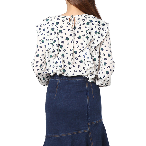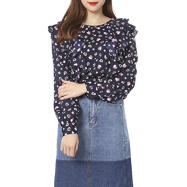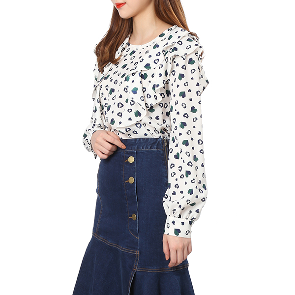 하트 패턴과 프릴 장식으로 포인트를 준 러블리 블라우스 입니다. 하늘거리는 쉬폰 소재로 고급스러운 여성스러움이 돋보이는 아이템 입니다.