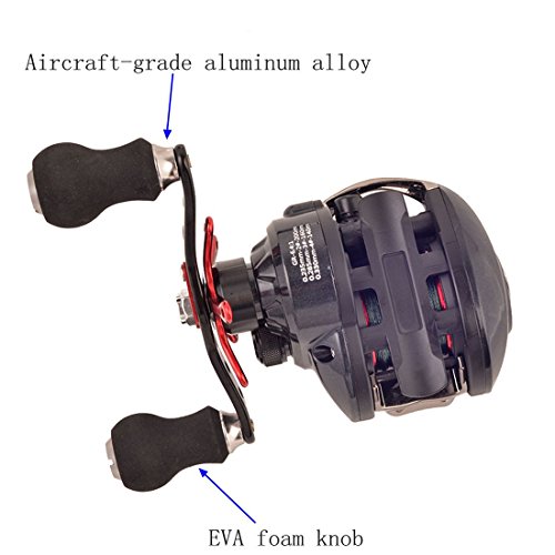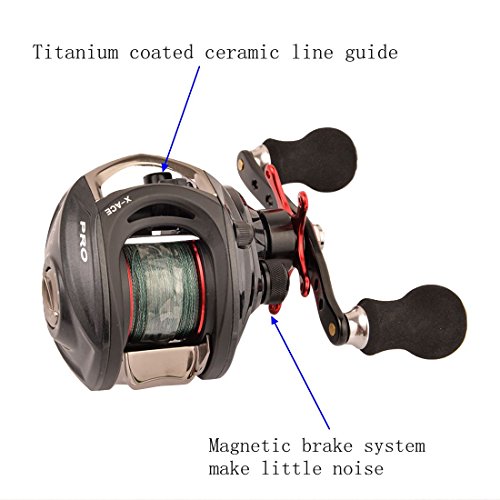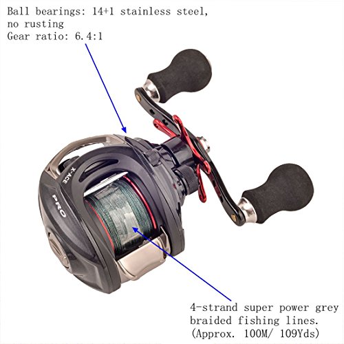-. Feature : DISTINCTIVE REELS & LINES COMBO: The baitcast reel is wrapped around the 4-strand super power grey braided fishing lines.The line is 30LB/ 0.23mm(Approx. 100M/ 109Yds). The ceramic insert line guide prevents damage to any line type: braid, fluorocarbon, or monofilament. / Aircraft-grade aluminum alloy, CNC machined spool and double brass ratch. High-tensile gear, precision and low noise. The Carbon Fiber baitcast reel uses smooth mesh precision ground weight reducing forged aerospace-grade aluminum gears in its high speed 6.4:1 gear ratio drive. / The latest R & D products: 14 shielded stainless steel ball bearings plus the one-way anti-reverse instant clutch system delivers the smoothest performance available and fast hook sets. The dynamic carbon fiber drag system reduces start up inertia for smooth line pull. / Titanium coated ceramic line guide reduces friction and improves durability. With brake weights that use inner friction against the raceway during the cast, this controls spool speed especially when using lighter lures, plus external adjustment knob provides for quick, precise adjustments for either the conditions or when you switch baits. / Super strong stainless steel gears and shaft provide the durability needed for fishing in the toughest conditions. SALTWATER & FRESHWATER approved. Our baitcaster with its unique light color scheme makes a perfect baitcaster for bass fishing rod and reel combo. YOU WON'T FIND THIS KIND OF VALUE ANYWHERE ELSE.