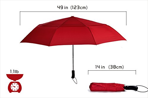 -. Feature : What is the most important quality for a good umbrella? The answer is that it can continuously provide a shelter for you in rainy days. This is what Yadacme has been doing. Our classic red automatic folding outdoor umbrella can solve all your worries about rainy days. / Innovative double wind-resistant canopy - our umbrellas adopt double wind-resistant umbrella cloth, so they have very strong anti-wind capacity; they also apply automatic opening design. It only takes one second to open the umbrella, so you do not need to hurry when the rain and wind come. / Oversize - the diameter of the umbrella cover is 49in (123cm), large enough to fully protect you and your friends away from the rain. With an ergonomic handle, you should not be tired when using the umbrella. / Portable and lightweight - the umbrella adopts ultra-light hollow aluminum alloy with quality wind-resistant resin material. It weights only 1.1lb (500 grams) for such a large size, and its folding length is 14in (37cm). Most backpacks are able to carry it, or you can put one in your car. / Commitment to quality - if you need any information, you can ask us. We will sincerely reply you immediately. After purchase, no matter what kind of problem appears, you just need to send an email and we certainly will solve the problem in time. We are willing to do anything to let you feel our sincerity.