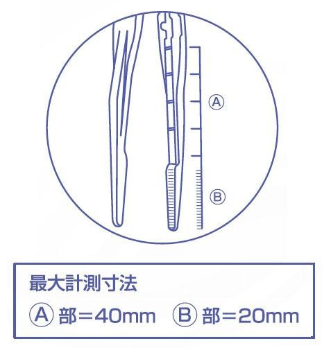 | 無鈎タイプでステンレス製ピンセットと近い使用感になります。内側に目盛りがあり、サイズ測定にご使用いただけます。滅菌済ですので、清潔にご使用いただけます。 |