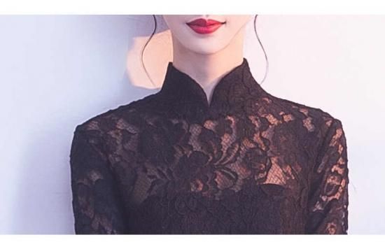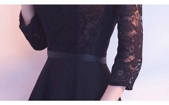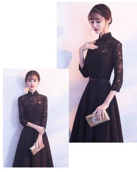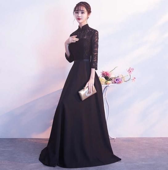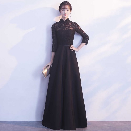 パーティードレス ロング丈 マオカラー ブラック ハイネック 七分袖 花柄レース シースルー 透け感 セクシー 上品 大人 drgz2162