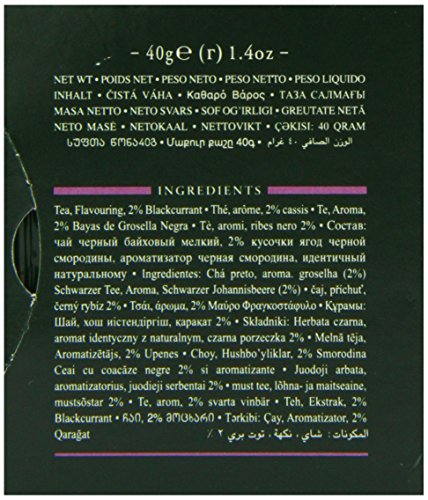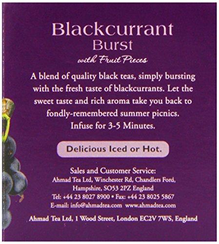 -. Binding : Grocery -. Brand : Ahmad Tea -. EAN : 0054881007108 -. Feature : Case of six boxes, each containing 20 foil-wrapped tea bags (120 total tea bags) / A blend of black teas with real blackcurrant flavoring / Stimulating tea with a resonant, fruity aroma / Enjoy the rare pleasure of a fine English tea / Ships in Certified Frustration-Free Packaging -. Label : Ahmad Tea -. Manufacturer : Ahmad Tea -. Model : 710 -. MPN : 710 -. NumberOfItems : 6 -. PackageQuantity : 6 -. PartNumber : 710 -. ProductGroup : Grocery -. ProductTypeName : GROCERY -. Publisher : Ahmad Tea -. ReleaseDate : 2006-02-27 -. Studio : Ahmad Tea -. Title : Ahmad Tea Blackcurrant Burst Black Tea, 20-Count Boxes (Pack of 6) -. UPC : 054881007108