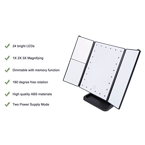 Built-in 24pcs LED lighted:it's allow you to do your make-up in the dark or poorly lit areas.Brightness is adjustable by touch sensor switch,long press to dim the light.