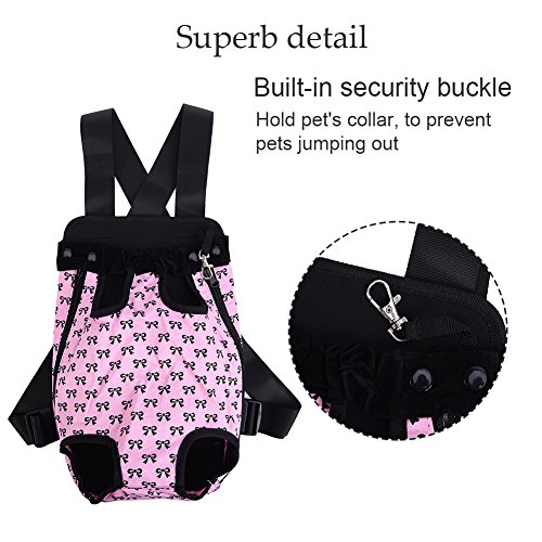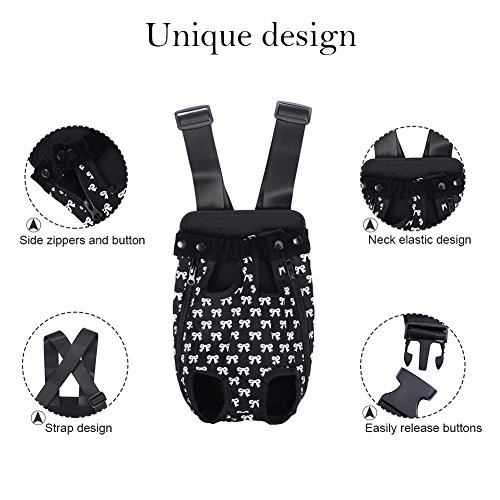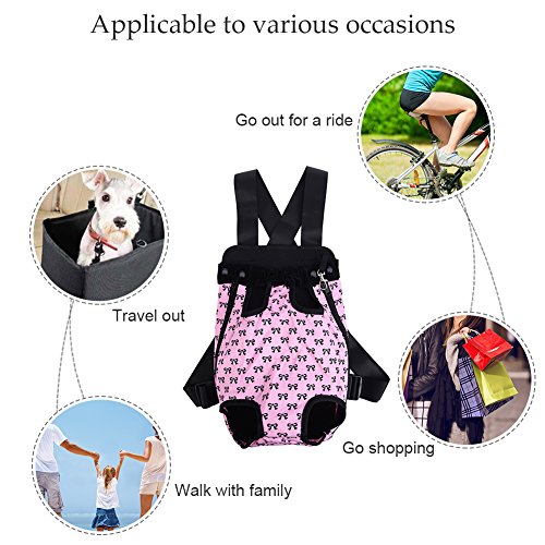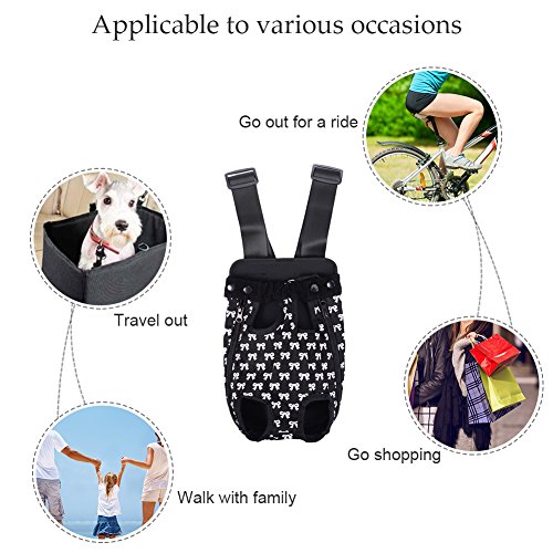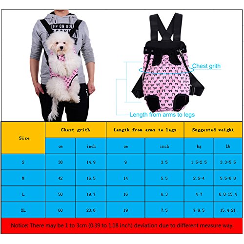 -. Feature : S: Chest: about 38 cm / 14.96 in;Distance between front and back leg: about 9 cm / 3.54 in;Item overall length: about 28 cm / 11.02 in / Pet travel carrier works fine, can let the pet with the owner of zero distance contact, it is easy to carry and safe to use. / You can take your beloved dog together anywhere and anytime when you want with the dog front carrier/ dog backpack carrier. / Different from the box-type pet backpack, it can keep the pet's head, tail and legs outside, making your pets enjoy sunshine and fresh air. / Small Size for pets up to 1.5-2.5 kg, Medium for 2.5-4 kg, Large for 4-7 kg, X-Large for 7-9.5 kg