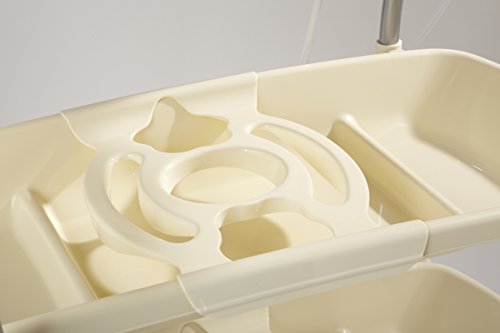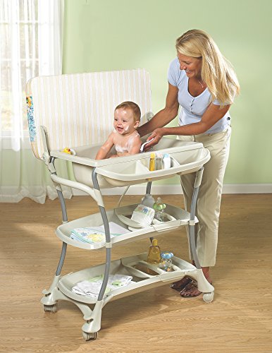 -. Feature : A complete Baby Changing Center with baby bath tub, changing pad, and a bath stand in one unit that can be easily wheeled to anywhere in your home - for ages 0-18 months / Equipped with 2 position baby bath - reclining infant (0-6 months) and stting toddler (6-18 months) - that has a contoured shape to ensure convenient and safe positioning of your child during bath time / Changing pad has a restraining strap for added safety and is made of easy to clean, soft, phthalate-free, vinyl fabric / Side attached storage tray and 2 large undercarriage trays provide easy access to all of the bathing and changing accessories you need in one place / Large contoured handles and 4 locking wheels make it easy to move the EuroSpa anywhere" your home