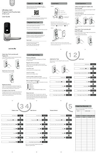 -. Feature : -95 fingerP.R.Ints, 95 codes and 3 backup mechanical keys / Ultraloq advanced fingerP.R.Int technology -Less than 0.5 second identification -Durable, waterproof and dustproof -Heal broken fingerP.R.Int lines -Works well for kids and the elder / Numeric touchscreen -User defined 4-8 digit codes -Antipeep password -Touch wakeup -Up to 95 codes / Hidden Key -Positioned specially on the bottom, keyhole gives extra security in case of keyhole hackers / Integrated Clutch Design -Innovation in clutch design. More reliable but 50% less power consumption than traditional clutches, Long Battery Life -Up to 8,000 times access. Low battery alarm on LCD, Wireless Bluetoth