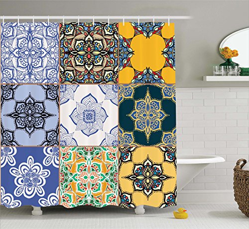 Moroccan Shower Curtain by Ambesonne, Set of African and Portuguese Tile Patterns Various Tones and Textures Boho Print, Fabric Bathroom Decor Set with Hooks, 75 Inches Long, Multicolor