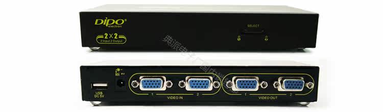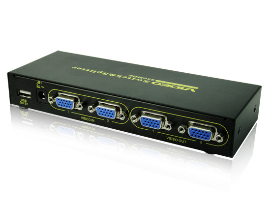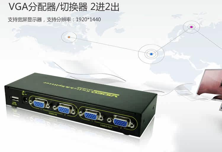 功能描述: 2路VGA信号切换输入,2路VGA信号同步输出相同内容,输入信号使用面板按键切换选择。