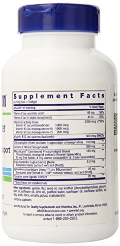 -. Binding : Health and Beauty -. Brand : Life Extension -. EAN : 0737870198062 -. Feature : Macu-guard carotenoid phospholipid blend: to support eye health, macular density and healthy vision / Vitamin K2: Studies show vitamin K2 provides superior benefits for bones, arteries, and other tissues / Super booster provides a potent dose of MK-7 and MK-4 (along with vitamin K1) to keep calcium in the bones and out of the arteries -. IsAdultProduct : 0 -. Label : Life Extension -. Manufacturer : Life Extension -. MPN : 01980 -. NumberOfItems : 1 -. PackageQuantity : 1 -. PartNumber : 01980 -. ProductGroup : Health and Beauty -. ProductTypeName : HEALTH_PERSONAL_CARE -. PublicationDate : 2015-01-18 -. Publisher : Life Extension -. ReleaseDate : 2015-03-19 -. Size : 60 -. Studio : Life Extension -. Title : Life Extension Once Daily Health Super Booster 60 Count -. UPC : 737870198062