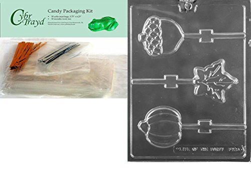 CybrTrayd F123 Fall Assorted Lollies Pumpkin, Leaf, Acorn Lolly Chocolate Candy Mold with 4.5-Inch Lollipop Sticks, Clear