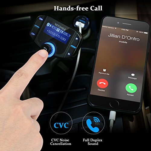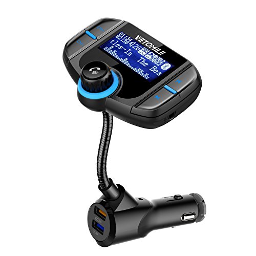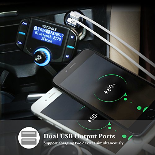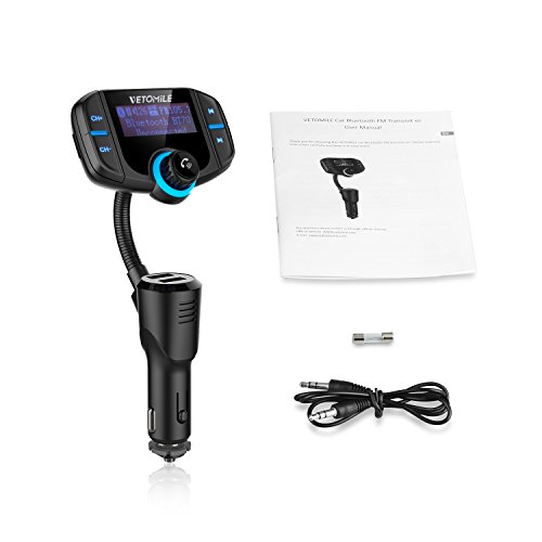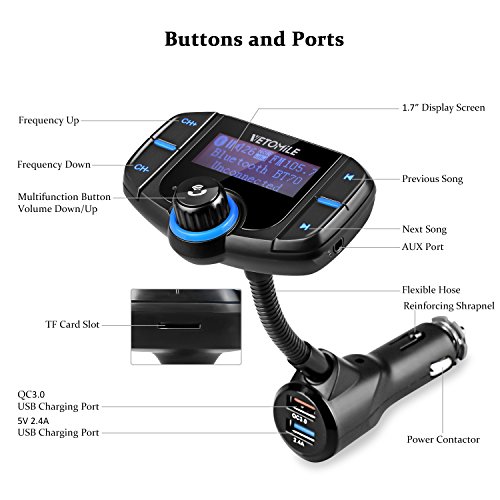 This Vetomile car Bluetooth FM transmitter features a 1.7inches large display screen and dual USB ports, it uses CVC technology and supports QC3.0 protocol to offer you clear talking, wonderful music and fast charging, you can also use it to complete a phone hands-free system that can communicate freely during your drving. Specifications: Brand: Vetomile Model: BT70 Color: Black Bluetooth: Bluetooth Version: V4.2+EDR Bluetooth Frequency: 2.4GHz Sensitivity: -42db + / 3db 360 Input Voltage: 12-24V Working Current: 75mA(Max) Standby Current: 20mA(Max) Orange USB Port Output: 3.5-6.5V/3A, 6.5-9V/2A, 9-12V/1.5A Blue USB Port Output: 5V/2.4A Effective Range: 5m Sensitivity: -92dBm RF Output: 4dBm FM Frequency: FM Frequency Range: 87.5-108MHz Effective Range: 2m Product Weight: 0.09kg Package Weight: 0.18kg Package Dimensions: 13.2 x 13 x 8.5cm / 5.2 x 5.1 x 3.3in Package includes: 1 x FM transmitter 1 x Audio line 1 x 3A fuse 1 x User manualFeature